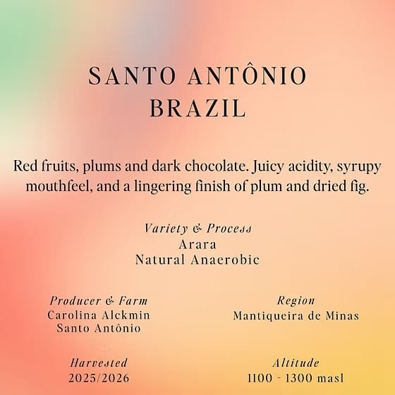 サント・アントニオ農園は、ブラジル・マンティケイラ・デ・ミナス山岳地帯に位置する四代続く家族経営の農園です。1933年、現オーナーの曽祖父アルシデス・モレイラが最初のコーヒーの木を植えて以来、アルクミン家の歴史にコーヒーは深く刻まれています。現在はカロリナ・アルクミンが農園を率い、品質・革新・持続可能性に明確な焦点を当てながら、その伝統を受け継いでいます。