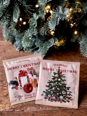 ティーバッグを大切に包む茶袋には、クリスマスツリーとクリスマスプレゼントの絵柄があしらわれてあるので、聖なる夜のひと時を盛り上げてくれることでしょう。